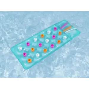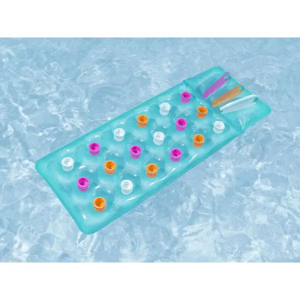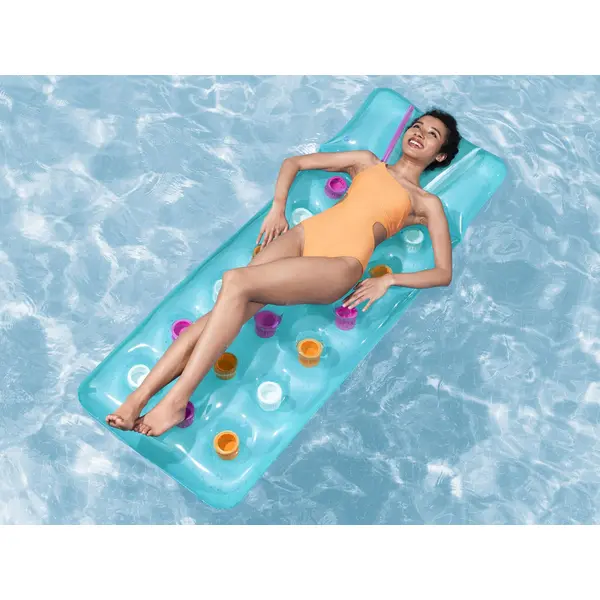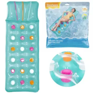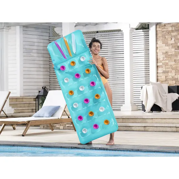 A Bestway felfújható strandmatrac párnával ideális választás nyári pihenéshez a medencében, tónál vagy a tengeren. Vidám, friss színeivel jól mutat a vízen, a beépített párna pedig kényelmesebb fekvést biztosít napozás és lebegés közben.
