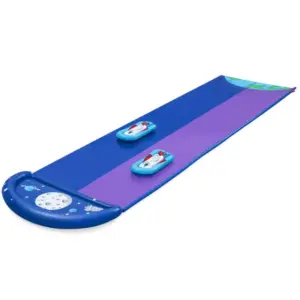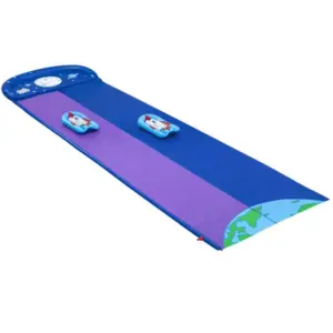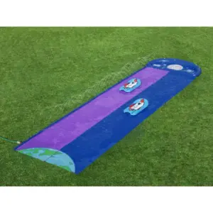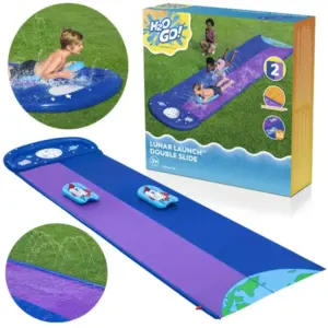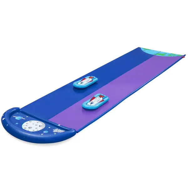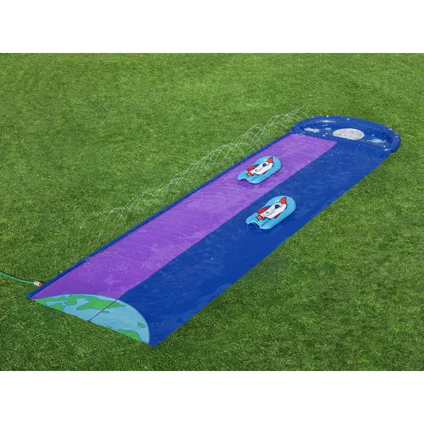 Űrtémájú, gyors és fröcskölős móka a forró nyári napokra! A két párhuzamos pályának köszönhetően a gyerekek egymás mellett versenyezhetnek, miközben a kert vagy a gyep igazi „kozmikus” csúszdapályává változik.