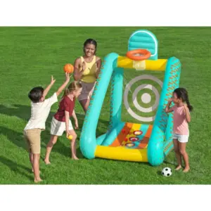 A szett három játékot kínál egyben: kosárlabdát, focit és célbadobós ügyességi játékot. Így a gyerekek egyszerre gyakorolhatják a pontosságot, a reflexeket, a szem-kéz koordinációt és az általános állóképességet. A nagyméretű kialakítás kényelmes játékteret ad, akár több gyereknek is egyszerre.