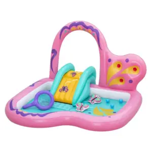 Bestway Butterfly Wonder™ vízi játszóközpont – vidám, pasztellszínű, pillangó formájú felfújható pancsoló, amelyet a legkisebbek (2 éves kortól) igényeihez terveztek. A nyári melegben egyszerre ad frissítő vízi élményt és ösztönöz aktív, mozgásos kültéri játékra.