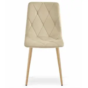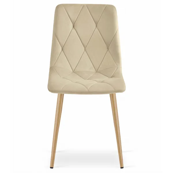 Bézs steppelt bársony étkezőszék, amely elegáns megjelenésével és kényelmes kialakításával tökéletes választás az étkezőbe vagy a nappaliba. A finom tapintású bársony kárpit, a dekoratív steppelés és a fa hatású, karcsú fém lábak harmonikusan illeszkednek modern, minimalista és glamour enteriőrökbe.