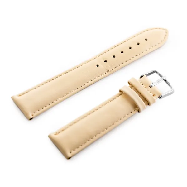 Természetes bőrből készült bézs óraszíj, hozzá illő bézs varrással és ezüstszínű fém csattal. Kényelmes, elegáns választás a mindennapi viselethez és klasszikus karórák frissítéséhez.