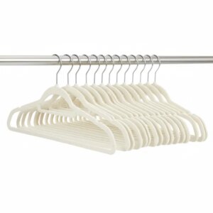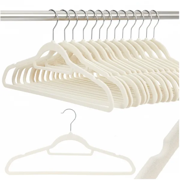 A bézs velúr vállfa készlet 20 darab csúszásmentes, helytakarékos fogasból áll, amelyek ideálisak finom blúzokhoz, öltönyökhöz és kabátokhoz is. A puha velúr bevonat megakadályozza a ruhák lecsúszását, a mindössze 2,2 mm vastag profil pedig értékes helyet szabadít fel a szekrényben. A 360°-ban forgatható krómozott kampó rugalmas hozzáférést biztosít, így könnyebb az öltözködés és a rendezés.