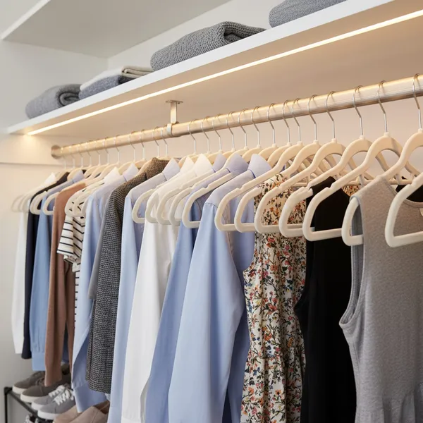A puha velúr bevonat megakadályozza, hogy blúzok, öltönyök vagy selyemruhák lecsússzanak, míg az extra vékony, 45 cm-es profil akár 50% hellyel bővíti a szekrénykapacitást, így több kedvenc darab fér el pormentesen. A 360°-ban forgatható kampó gyors hozzáférést biztosít öltözködés közben, és segít rendszerezni a gardróbot.
