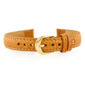 A természetes bőr illeszkedik a csuklód formájához, a kontrasztos bézs varrás pedig elegáns részleteket ad. A rozsdamentes acélból készült, arany színű csat biztonságosan rögzíti a szíjat, és jól illeszkedik az aranytokos órákhoz.
