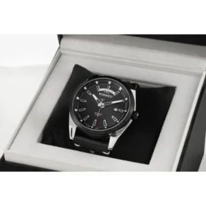 A 40 mm-es, részben fekete gyűrűvel díszített rozsdamentes acél tokot karcálló ásványi üveg borítja, a fekete számlap ezüst-fehér indexekkel letisztult, jól olvasható megjelenést ad. A dátum és nap kijelzés tovább növeli a mindennapi praktikusságot, a 5 ATM vízállóság pedig megóvja a szerkezetet az eső vagy kézmosás okozta fröccsenésektől.
