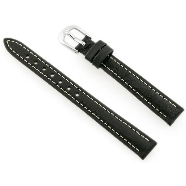 Természetes bőrből készült, fekete színű óraszíj elegáns bézs varrással. A szíj klasszikus megjelenését ezüstszínű, rozsdamentes acél csat egészíti ki, amely tartós és kényelmes viseletet biztosít a mindennapokban.