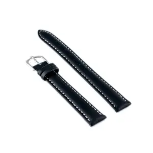 Természetes bőrből készült fekete óraszíj elegáns fehér varrással. A kényelmes, klasszikus kialakítást ezüstszínű, rozsdamentes acél csat egészíti ki, amely tartós és mindennapi használatra is ideális.