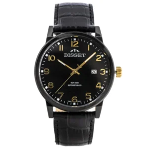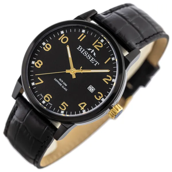 Bisset férfi karóra, fekete acéltok, szafírüveg, bőrszíj, WR50, dátum