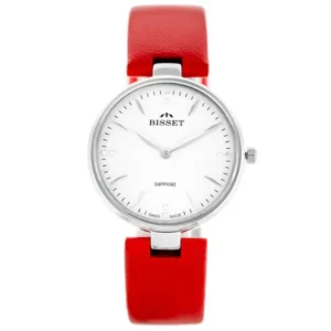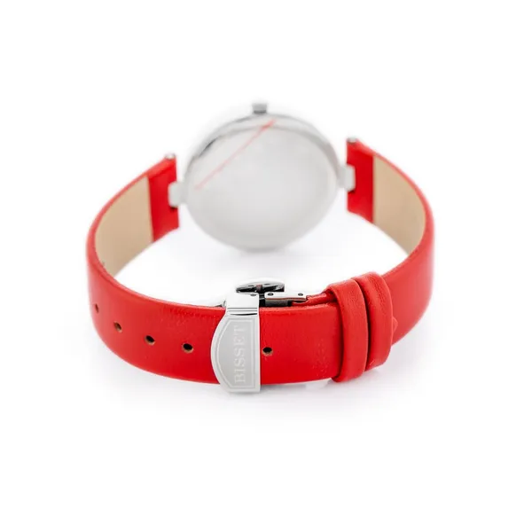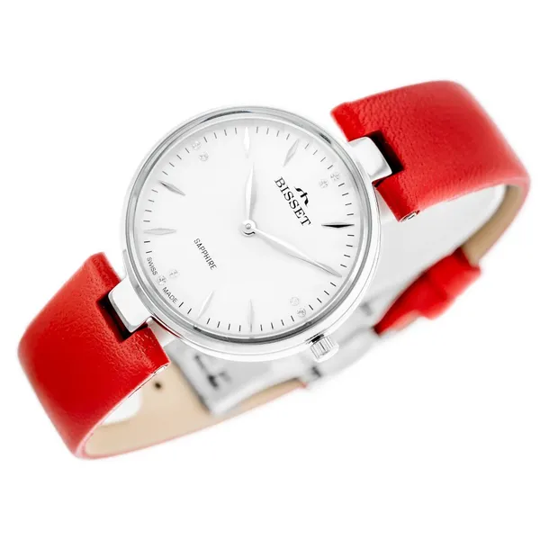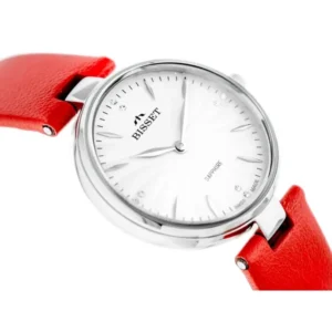 Könnyed elegancia svájci pontossággal: a Bisset karórában a karcálló zafírüveg, az antiallergén acéltok és a piros, pillangócsattal záródó valódi bőrszíj találkozik, hogy stílusosan és megbízhatóan kísérjen a nap minden percében.
