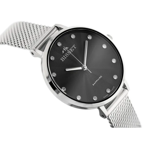 Kényeztesd magad svájci pontosságú eleganciával! A Bisset BSBF30 női karóra letisztult, modern megjelenését az ezüstszínű nemesacél tok és braszlet, valamint a szürke számlapot ékesítő cirkónia indexek teszik különlegessé. A karcálló zafírüveg megőrzi a karóra hibátlan fényét, míg az antiallergén bevonat és az állítható kapcsos zár gondoskodik a kényelmes viselésről.
