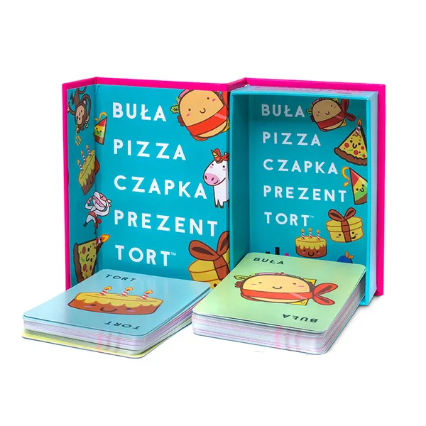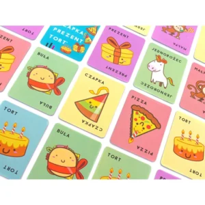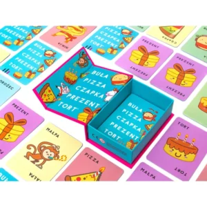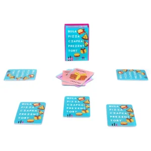 A „Buła, Pizza, Czapka, Prezent, Tort” egy őrülten pörgős kártyajáték, ami pillanatok alatt felrázza a társaságot. Ritmus, figyelem és villámgyors reakciók kellenek hozzá – a szabályok egyszerűek, de egyetlen hiba elég, és máris borul az előnyöd.