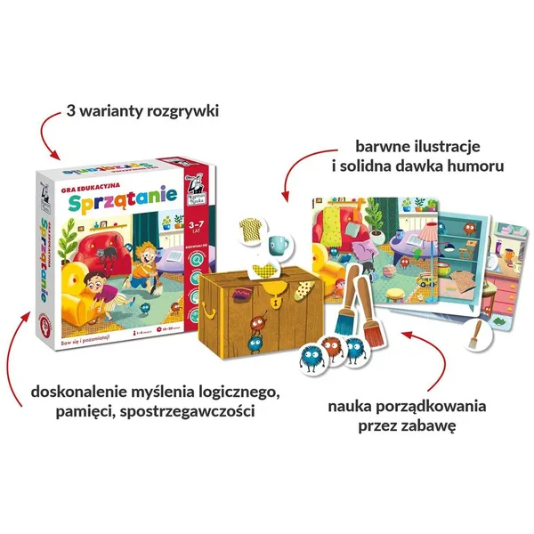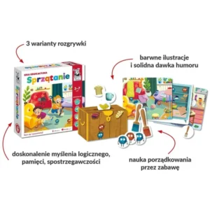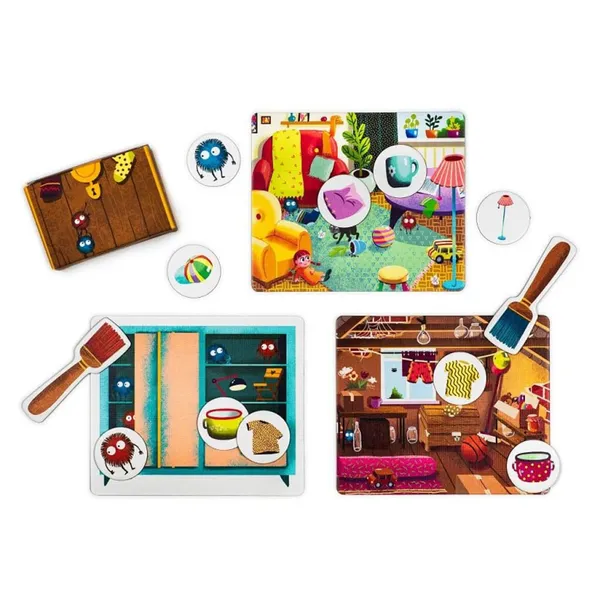 A társasjáték fejleszti a logikus gondolkodást, a memóriát, a megfigyelőképességet és a reflexeket, miközben pozitív élménnyé teszi a takarítást. A vastag kartonból készült táblák és zsetonok strapabíróak, így a legmozgalmasabb játszmák során sem sérülnek.