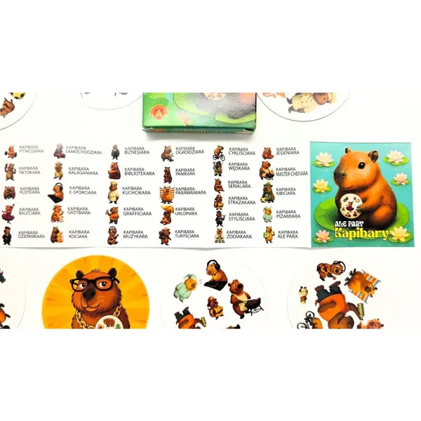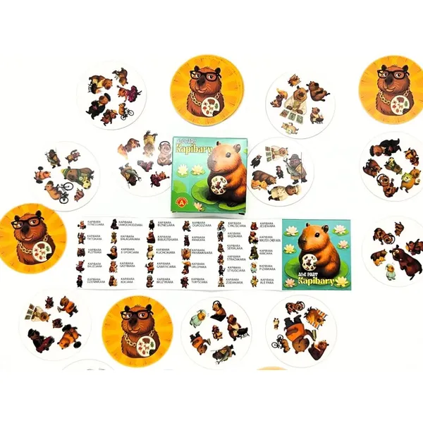 A csomag 31 kerek kártyát tartalmaz, mindegyiken kedves, humoros illusztrációkkal: kapibara balerinaként, zenészként, üzletasszonyként, kertészként, sportkedvelőként vagy akár autóvezetőként. Bármely két kártyán pontosan egy közös kép található, de az eltérő méret, pozíció vagy elforgatás miatt a feladat trükkösebb, mint elsőre tűnik.