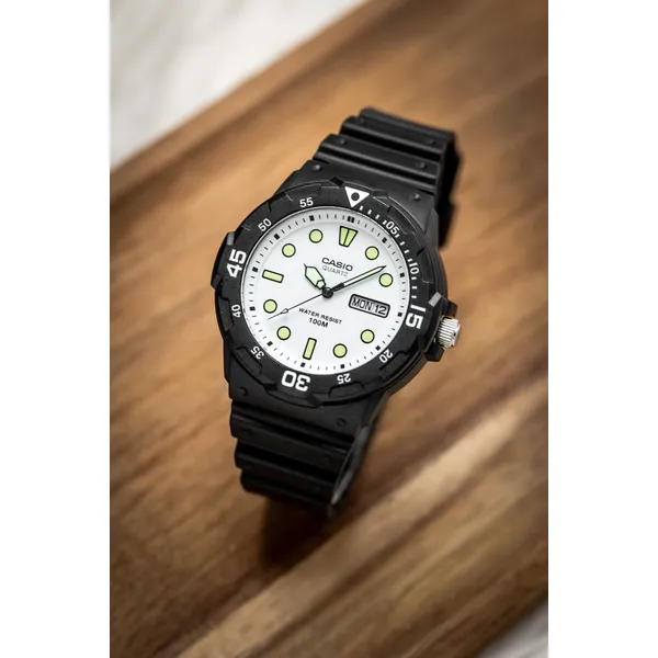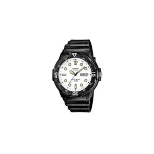 100 m-ig vízálló, könnyű Casio sportóra dátumkijelzővel és nagy kontrasztú fehér számlappal. Strapabíró műanyag tokja, rugalmas szíja és megbízható kvarc szerkezete tökéletes társ a munkában és a szabadidős kalandok során.