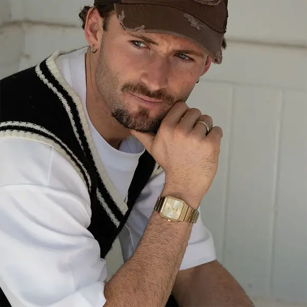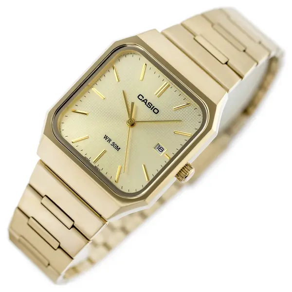 Elegáns arany számlap és tartós nemesacél kivitel a mindennapokra. A dátumkijelzés gyors tájékozódást ad, a WR50 vízállóság pedig gondtalan viseletet biztosít esőben vagy kézmosásnál is.