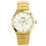 Elegáns, mégis praktikus választás a mindennapokra. A Casio MTP-V300G-7A férfi karóra a klasszikus megjelenést ötvözi a megbízható időméréssel. Az arany színű, rozsdamentes acél tok és szíj igényes, tartós viseletet ad, a fehér számlap pedig letisztult, könnyen leolvasható összhatást teremt.