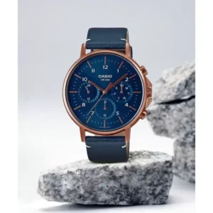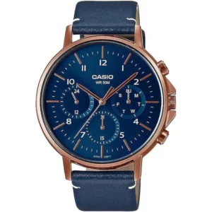 Casio férfi karóra, kék számlap, rose gold tok, bőrszíj, dátum, WR50