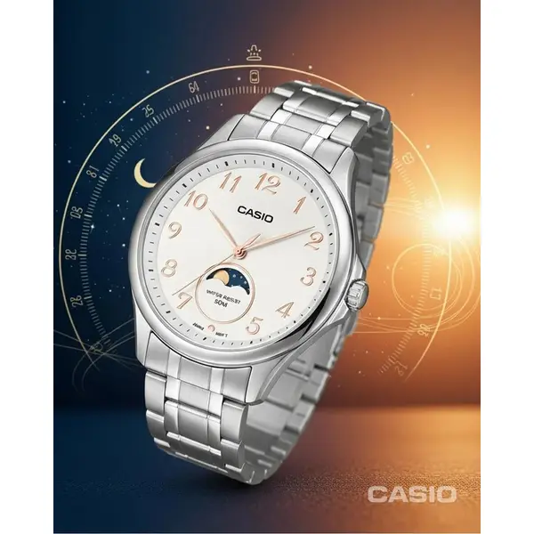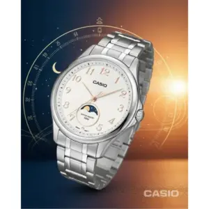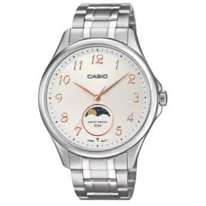 A Casio MTP-M110D-7A férfi karóra a letisztult eleganciát és a mindennapi praktikumot ötvözi. A kerek, ezüstszínű rozsdamentes acél tok és a hozzá illő acélszíj időtálló, univerzális megjelenést ad, amely könnyedén passzol hétköznapi viselethez és formális öltözékhez is. A visszafogott fehér számlapon az egyszerű indexek és a karcsú, aranyszínű mutatók kiváló leolvashatóságot biztosítanak.