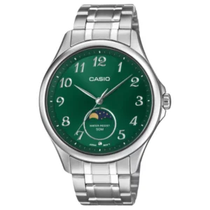 Casio férfi karóra zöld számlappal, acél szíjjal, holdfázis, WR50
