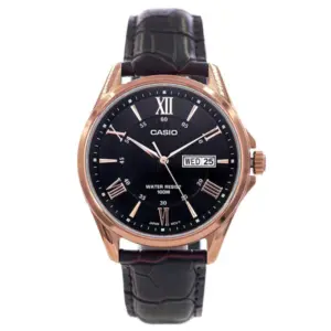 Casio Collection férfi karóra, elegáns és sokoldalú választás a mindennapokra és alkalmi viselethez. A fekete analóg számlap, a rózsaarany színű tok és a barna bőrszíj kifinomult, időtálló megjelenést ad.