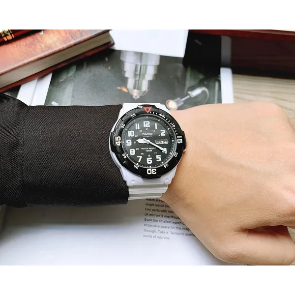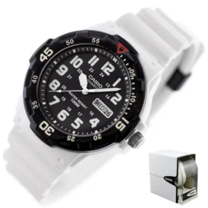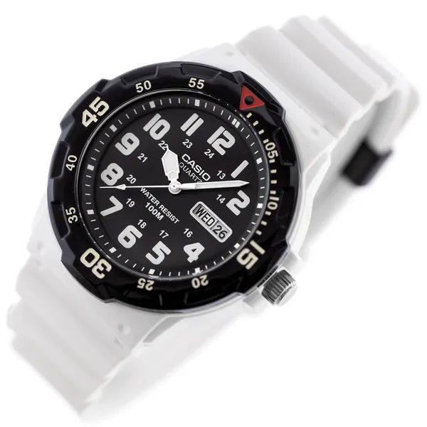 A Casio MRW-200HC-7BVDF férfi karóra sportos megjelenést és hétköznapi praktikusságot kínál egyetlen könnyű, tartós eszközben. A 44 mm-es fekete műanyag tok és a fehér, rugalmas szíj kihangsúlyozza a kontrasztos, modern stílust, miközben kényelmes viseletet biztosít egész nap.