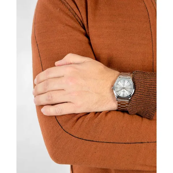 Az elegáns Casio MTP-V006D-7CUDF férfi karóra letisztult ezüst megjelenésével minden alkalomhoz illik. A rozsdamentes acél tok és bransolet tartósságot biztosít, míg a 38 mm-es, ásványi üveggel védett számlap fekete indexei könnyű leolvashatóságot adnak. A megbízható japán kvarc szerkezet pontos időt nyújt, a dátumkijelzés pedig praktikus kiegészítője a mindennapoknak. 30 m vízállóságának köszönhetően nem kell aggódnia egy-egy esőcsepp vagy kézmosás miatt.