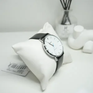 Elegáns ezüstszínű nemesacél tokja mindössze 8 mm vékony, ezért zakó alatt is kényelmes, a 40 mm-es átmérő pedig diszkrét, mégis jól leolvasható megjelenést biztosít. A fehér számlapot karcálló ásványi üveg védi, a kontrasztos ezüst indexek pedig gyors időleolvasást tesznek lehetővé.