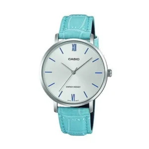 Casio női кварц karóra 34 mm, ezüst számlap, türkiz bőrszíj, WR30