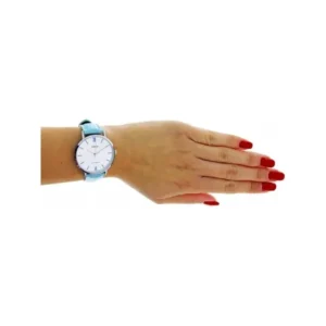 A fényes ezüstszínű nemesacél tok különleges kontrasztot alkot a természetes bőrből készült türkiz szíjjal, amely karakteres, mégis nőies megjelenést ad.