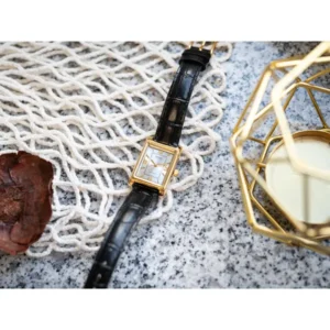 Az aranyszínű, rozsdamentes acél tok elegáns kontrasztot alkot a fekete, valódi bőr szíjjal, így a modell egyszerre klasszikus és karakteres. A WR30 (30 m) vízállóság a fröccsenések és a mindennapi nedvesség ellen nyújt alapvető védelmet.