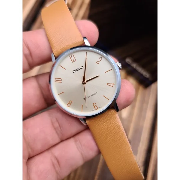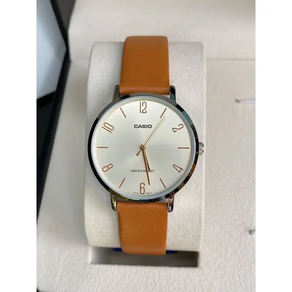 Casio női кварc karóra, arany számlap, barna bőrszíj, WR30, 34 mm