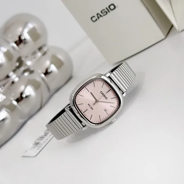 Casio női кварc karóra, ezüst acél szíjjal, rózsaszín számlappal, WR50