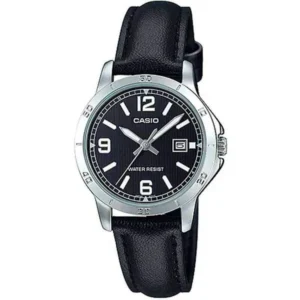 A Casio LTP-V004L-1B női karóra finom, mégis határozott megjelenést ad: a fekete bőrszíj, a fekete számlap és az ezüstszínű tok elegáns összhangot alkot. Diszkrét dátumkijelzése praktikus a mindennapokban, miközben a klasszikus forma alkalmi viselethez is remekül illik.