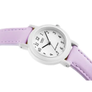 Fiatal hölgyeknek tervezett, kompakt méretű női karóra, amely egyszerre stílusos és praktikus. A lila, valódi bőrből készült szíj puha és hajlékony, így kényelmesen követi a csukló vonalát. A fehér, 25 mm-es műanyag tok és a nagy, jól olvasható arab számokkal nyomtatott analóg számlap gyors időleolvasást tesznek lehetővé.