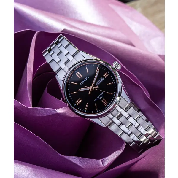 Casio női karóra LTP-1335D-1A2, acél karkötő, fekete számlap, dátum, WR50