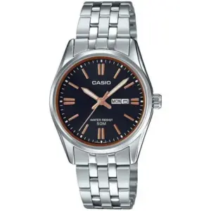 A Casio LTP-1335D-1A2 női karóra az elegáns, mindennap is jól viselhető stílust ötvözi a megbízható pontossággal. A karcsú, ezüstszínű acél tok és az ehhez illő acél karkötő időtálló megjelenést ad, amely könnyen passzol irodai, hétköznapi vagy alkalmi öltözékhez. A kerek, fekete számlap letisztult jelölései gyors leolvashatóságot biztosítanak, miközben megmarad a visszafogott, nőies összhatás.