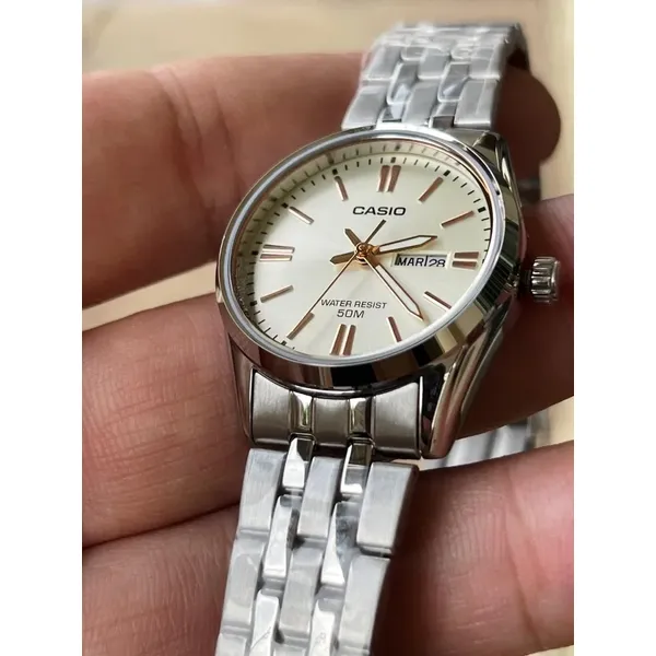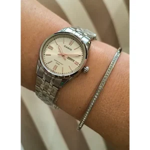 A Casio LTP-1335D-9A női karóra elegáns, letisztult megjelenést kínál mindennapi viselethez és alkalmi szettekhez egyaránt. A karcsú, ezüstszínű acél tok és az ehhez illő acélcsat kifinomult, időtálló stílust ad, az arany színű, kerek számlap pedig finom ragyogással emeli ki a megjelenést. A kvarc szerkezet pontos járást biztosít, így megbízható társ a sűrű hétköznapokban is.