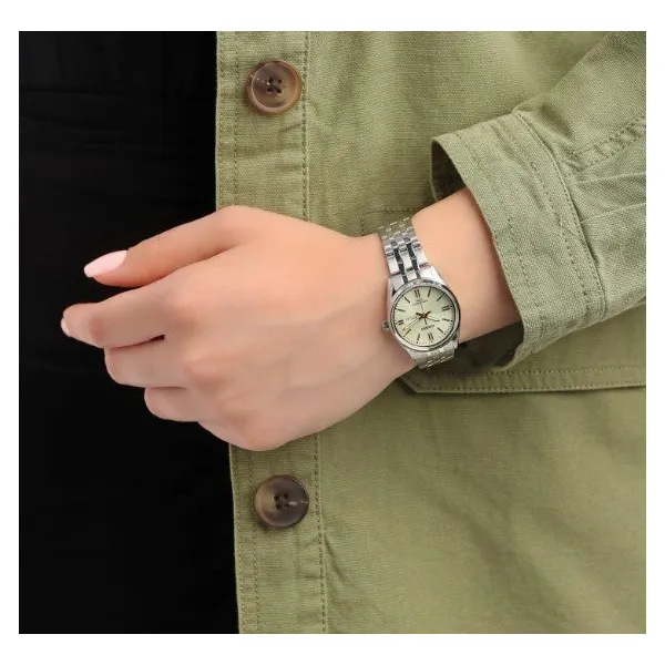 Elegáns acél karóra arany számlappal, amely könnyen illik irodai és alkalmi viselethez is. Pontos кварc szerkezete, WR50 vízállósága és praktikus dátumkijelzése kényelmet ad a mindennapokban, a díszdoboz pedig ajándéknak is ideálissá teszi.