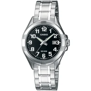 Casio női kvarc karóra fekete számlappal, acél szíjjal, WR50