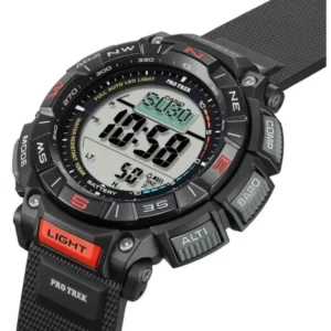A Casio Pro Trek PRG-340-1ER férfi óra ideális választás túrázáshoz és mindennapi használatra is, ha megbízható, sokfunkciós társat keresel. A napelemes működés gondoskodik a kényelmes üzemeltetésről, a digitális kijelző pedig jól olvasható, háttérvilágítással kiegészítve (kézi vagy automatikus). A 10 ATM vízállóság lehetővé teszi az úszást is, a strapabíró műanyag szíj pedig könnyen tisztán tartható, kényelmes viselet.