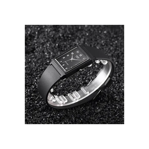 Letisztult, fekete unisex karóra téglalap alakú tokkal, amely kényelmes viseletet és jól kombinálható, időtálló stílust kínál a mindennapokra. A кварc szerkezet, a könnyű kialakítás és a WR30 vízállóság praktikus választássá teszi aktív hétköznapokhoz is.