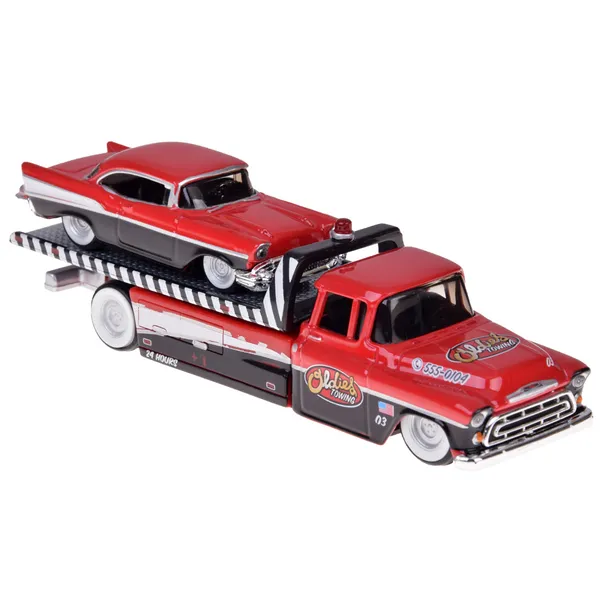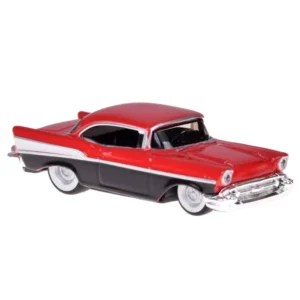 Egy igazi klasszikus páros a vitrinbe vagy a játékasztalra: a licencelt 1957-es Chevrolet Flatbed teherautó és a legendás 1957-es Chevrolet Bel Air 1:64 méretarányban, látványos piros fényezéssel. A stabil, öntött fém karosszéria és a részletgazdag kidolgozás a kor hangulatát idézi, míg a műanyag alváz könnyedséget biztosít. A Flatbed platója alkalmas a Bel Air biztonságos szállítására, így a modell nemcsak dekoráció, hanem interaktív élmény is.