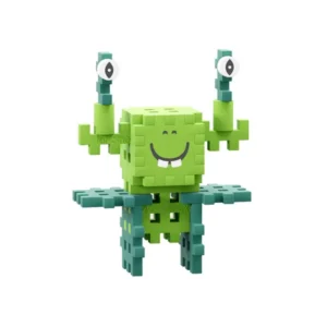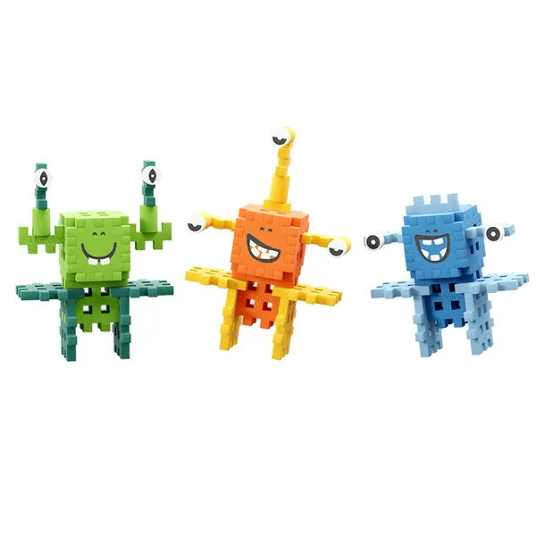 Három barátságos, sárga, zöld és kék űrszörny érkezett a galaxis távoli pontjáról, hogy a gyerekekkel együtt fedezzék fel a Föld titkait. A 60 darab, kb. 3,5 × 3,5 × 0,5 cm-es mini blokk segítségével a kicsik saját kezűleg állíthatják össze a figurákat, majd eljátszhatják a végtelen történeteket.