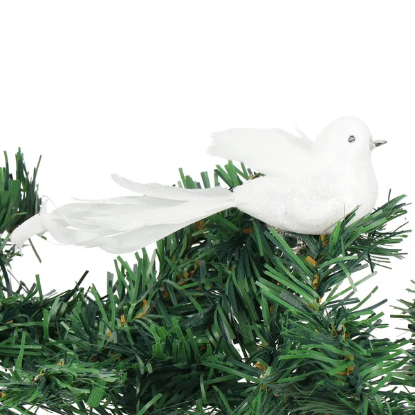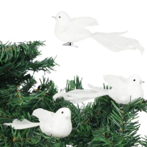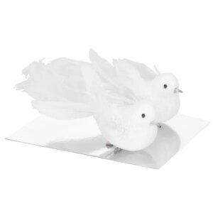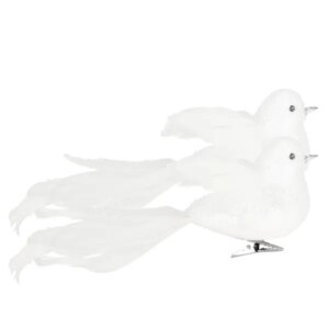Az ünnepi asztal, koszorú vagy karácsonyfa mesés kiegészítője lehet ez a két darabos, csillámos madár dísz szett. A 15 cm hosszú, fehér habszivacs testet szikrázó brokát borítja, a szárnyak és a hosszú farok élethű tollhatású, a kristályszerű csőr pedig plusz ragyogást ad.