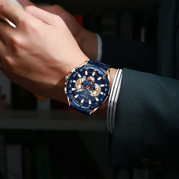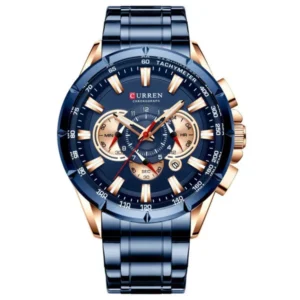 Kék számlapos, fém szíjas férfi karóra kronográffal és dátumkijelzéssel, amely egyszerre praktikus és látványos. A rosegold részletek kiemelik a megjelenést, az antiallergén bevonat pedig kényelmesebb viseletet ad a mindennapokban.