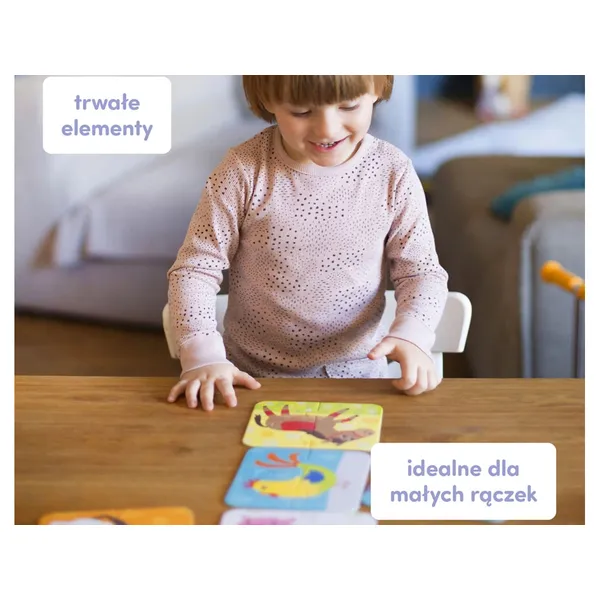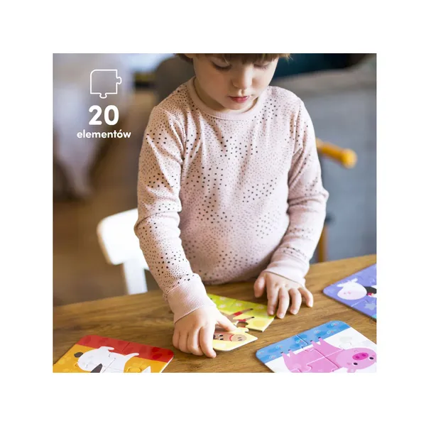 Az öt, egyenként négydarabos puzzle vastag kartonból készült, így a pici kezek könnyen meg tudják fogni, és biztonságosan gyakorolhatják a finommotorikát. A szerethető állatképek beszélgetésre ösztönzik a gyerekeket, miközben önálló sikerélményt kínálnak.