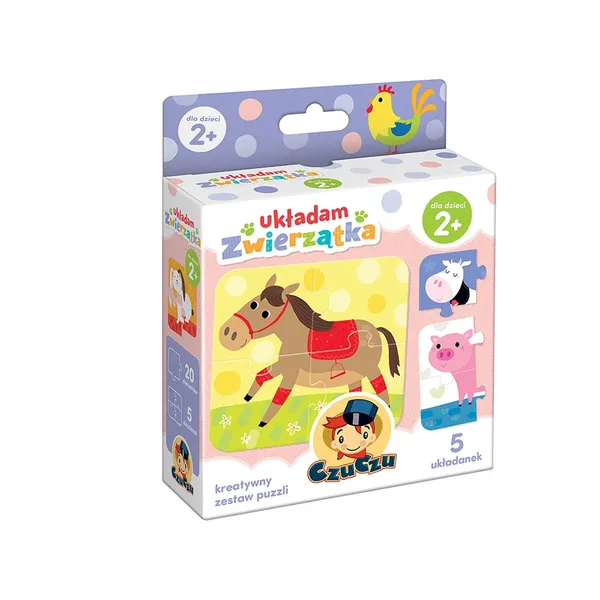 A CzuCzu állatos kirakó készlet öt, egyenként 4 részes puzzle-ből áll, amelyet kifejezetten 2 éves kortól ajánlunk. A vastag, lekerekített kartondarabok könnyen megfoghatók, így biztonságosan fejlesztik a finommotorikát és a szem-kéz koordinációt.