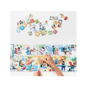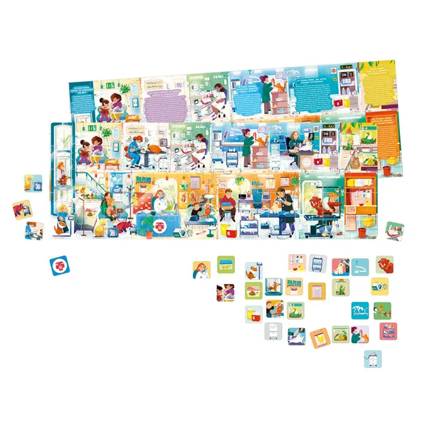 Fedezzétek fel, hogyan dolgozik egy állatorvos! A nagy, színes kirakó 60 tartós elemből áll, amelyek egy forgalmas állatklinika életét ábrázolják. A 4 évesnél idősebb gyerekek játék közben fejleszthetik finommotorikájukat, megfigyelőképességüket és szókincsüket.