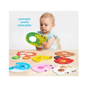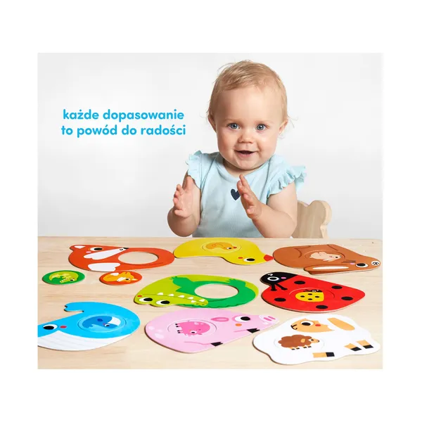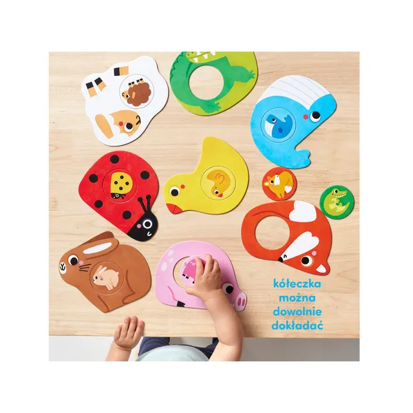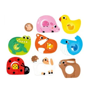 Pattintsátok ki együtt a köröket, majd nevezd meg az állatokat, a színeket és hangokat! Próbáljátok fordítva, fejjel lefelé vagy összekeverve is összepárosítani a darabokat – minden sikeres illesztés mosolyt és önbizalmat ad a kicsinek.
